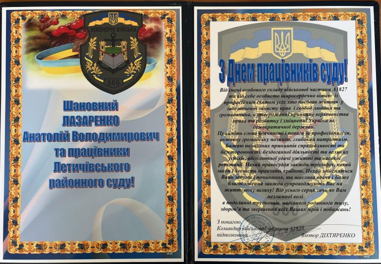 Командир військової частини привітав суддів та колектив Летичівського районного суду Хмельницької області з нагоди Дня працівників суду